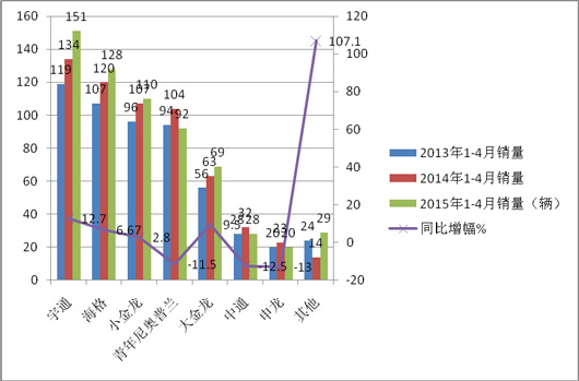 从车管部门监测的数据可知,各主流企业2015年1-4月在四川区域销售的旅游客车统计