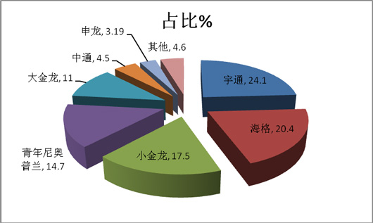 从上表可以看出,1-4月在四川区域旅游客车销量最大的是宇通客车,其次是海格客车,再次是小金龙,第四是尼奥普兰。三龙一通和青年尼奥普兰是四川市场旅游客车的主流品牌。且同比市场份额均有不同程度的提高和降低。