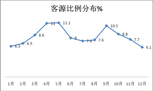 根据上图表可知,4月、5月、9月是国内游客到四川旅游的高峰,均超出了10%,5月最高,4月次之,再次是9月,其余月份均无明显规律。