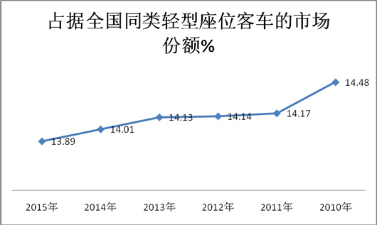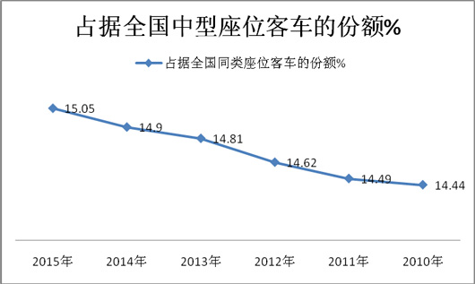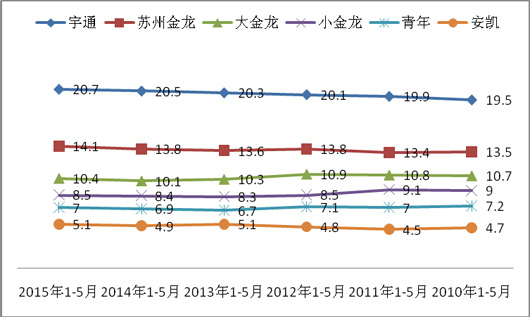 根据上牌数据查阅计算,主流客车企业2015年1-5月及近6年在长三角主流区域座位客车市场份额与比较表(%)