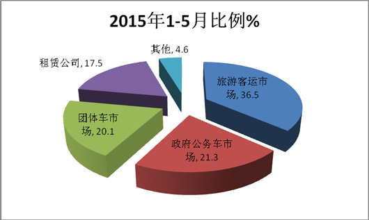 2、主要目标市场销售比例情况分析。从市场调研情况暖和上牌数据统计看,2015年1-5月广东区域共销售考斯特客车634辆,同比2014年增长6.25%,按目标用途划分,使用最多的是旅游客运市场,其次是政府公务用车市场,再次是团体包车市场。具体其比例大致如下: