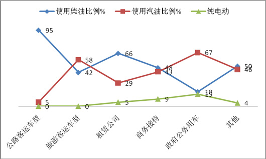 3、按动力种类来划分,2015年1-5月广东市场考斯特客车用于客运的车型大部分喜欢柴油;用于旅游的车型近6成喜欢汽油,近4成偏好柴油;用于商务接待的车型近柴油汽油几乎各占40%以上,纯电动占据9%,而政府公务用车则67%以上喜欢汽油,15%喜欢纯电动。具体比例如下表: