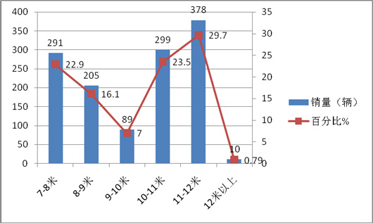 从上图表可以看出:广西市场,11-12米是主打产品,其次是7-8米,再次是10-11米,销量最小的是12米以上的特大型客车,次小的是9-10米,再次是8-9米.