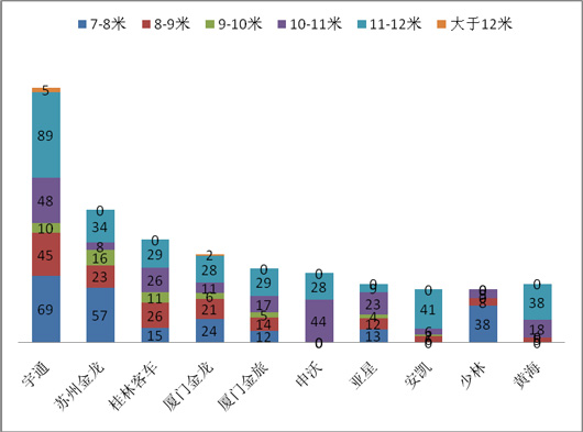 2、广西市场集中度最高的长度段是11-12米段,而且主要是客车老大的宇通客车品牌,其次是7-8米段,再次是8-9米长度段。同时11-12米段也是市场容量最大的细分市场,说明广西的中长途客运比较发达,9-10米段和10-11米段集中度比较低,是相对门槛比较低的细分市场,其他客车企业相对比较容易进入。