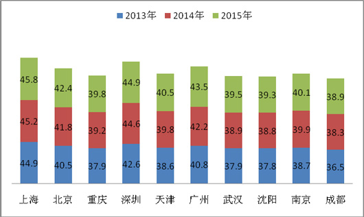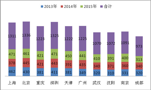 2、近3年来,上海、北京等十大城市的11-12米公交销量集中度呈现逐年上升趋势,从2013年的58.1%逐年提高到2015年的60.1%,市场集中度在逐年提高,说明全国其他区域市场的11-12米大型公交车市场份额在逐年下降。