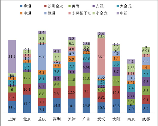 4、在十大城市中,宇通客车是11-12米公交中最为认可的品牌,其次是苏州金龙,再次是黄海。属地企业生产的11-12米公交在当地销售占有明显的优势,十大一线城市中,重庆市场竞争最为不充分,南京竞争则最为分散。