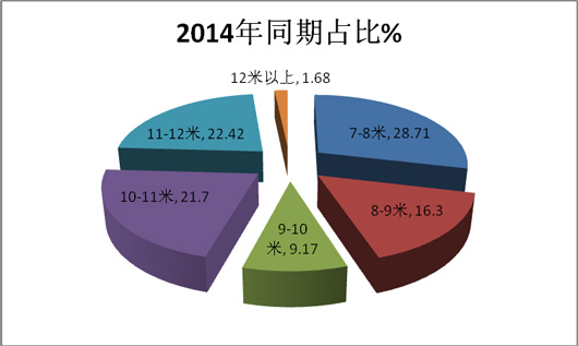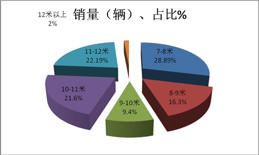 3、7-8米和11-12米段是广东市场中需求较大的两个长度段产品,需求最小的是特大型客车。7-10米中型客车增长,10米以上大型(含特大型)客车降低。