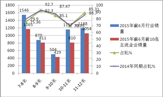 从上图表可以看出:2015年前6月广东市场,7-8米是主打产品,销售1546辆,占整个长度细分市场的28.89%,同比稍微提高;其次是11-12米段,销售1171辆,占整个长度细分市场的22.42%.,同比稍微下降;再次是10-11米客车,销售1157辆,占整个长度细分市场的21.7%,同步基本持平;第四是8-9米段,销售879辆,占整个长度细分市场16.4%,同比稳中有微升;第五是9-10米段,销售504辆,占整个长度细分市场的9.17%.同比稍有上升;销量最小的是12米以上的特大型客车段,销售为79辆,占据的比例为1.48%,销量及占比均下降。由此可见,广东市场2015年上半年大型客车同比下降,而7-10米中型客车同比上升。
