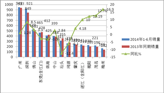 1、广东区域2014年前6月座位客车占据的比例最大,同比下降了15.6个百分点;其次销量大的是公交,上升的幅度为0.57%;第三销量大的是团体客车,同比比例上升了2.49个百分点;第四销量大的是新能源客车,同比上升了131.2个百分点,权重也上升了7.47个百分点,均为最大;第五是旅游客车,上升的幅度较小,第六是校车,同比下降了23.3%,是所有细分市场中降幅幅最大的。