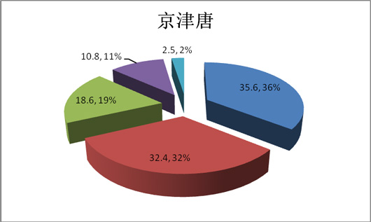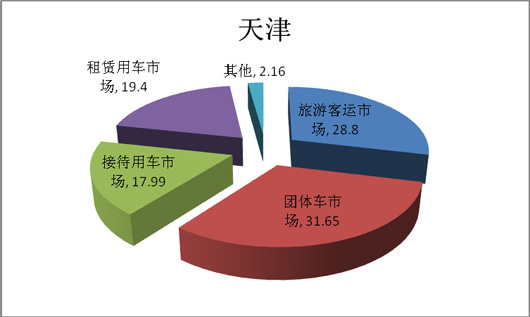 2、就整个京津唐地区综合来看,旅游客车市场占据超过了整个区域的三分之一,团体客车占据的比例超过接近三分之一;接待用车市场占据18.6%的市场比例;租赁市场占据了10.8%的权重。