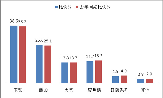 从上图表可知,玉柴发动机占据了五大区域11-12米公路客车38.6%的比例,且比2014年同期提高了0.4个百分点,居于第一,其次潍柴发动机,占据了25.1%的比例,比2014年也有所提升;进口发动机主要以康明斯为主,占据了14.7%,其次日韩发动机占据了4.9%。同时还可以看出,国产发动机的比例有所提高,进口发动机的品牌同比有所下降,日韩系列品牌发动机有所下降,这给公路大客车制造企业在西北五大区域市场营销方面提供了具体的参考依据。