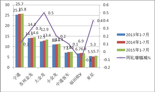 2015年1-7月三龙二通、福田、亚星等主流公路客车企业的11-12米公路客车总量占据五大区域市场的集中度为85.1%,而去年同期其集中度为83.6%,今年1-7月集中度同比上升了1.5个百分点,一方面说明三龙二通等主流公路客车企业是上述五大区域11-12米公路客车的绝对垄断者,同时其垄断地位还在加强,主要原因大致是: