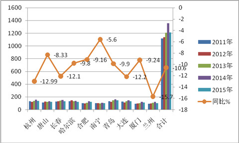 1.杭州、唐山、长春、哈尔滨、合肥、南宁、青岛、大连、厦门、兰州等十大二线城市近5年1-7月10-11米公交的市场份额总和均在16%左右上下振荡。2011年市场份额最大为16.39%,2012年最小为15.99%。虽然2015年前7月销量同比均降低,但十大二线城市10-11米公交的市场集中度同比却提高了01.8个百分点,一方面说明了十大二线城市的10-11米公交采购量每年都大约在市场总体需求的六分之一左右,可谓举足轻重,另外也说明2015年前7月十大二线城市10-11米公交的垄断程度在加强。这种较为具体的数据统计计算,无疑给大中型公交客车制造企业今后进入上述十大二线城市的10-11米公交市场制定营销策略提供了量化依据。