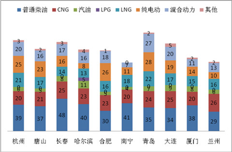 2、在二线十大城市中,传统柴油燃料仍然是10-11米公交的主要配置,但市场比例急剧下降,而新能源公交客车市场比例则正好相反,市场权重急剧上升。