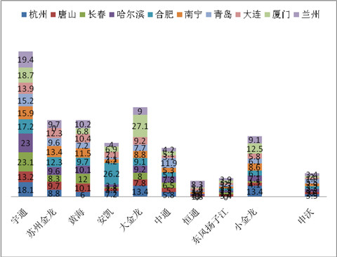 2、主流企业在合肥的10-11米公交市场集中度最高,达到了91.8%左右,其次是东南沿海的厦门83.9%,再次是大西北的兰州80.2%。