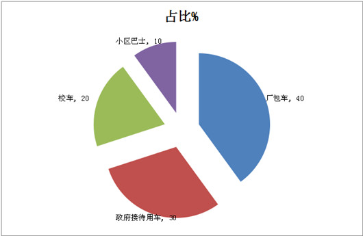 2、需求的用途调研。在抽取的10家汽车租赁公司需求的6家中,1-7月对6-8米纯电动客车实际目标市场划分大致情况: