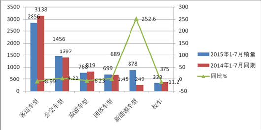 从上图表看出:1、客运车型是2015年1-7月山东市场大中客市场中最大的细分市场。其次是公交,再次新能源客车市场,第四是旅游客运车型,第五是团体客车市场,第六是校车市场。