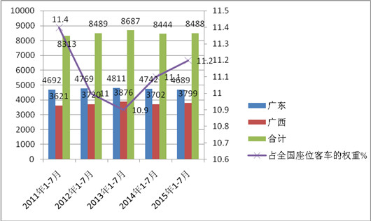 1、近5年1-7月华南区域座位客车的销量在前3年是增长的,但到了2014年1-7月后却逐年下降,直至2015年1-7月;占据全国座位客车的市场权重基本维持在11%左右,并呈现“V”字形现象。