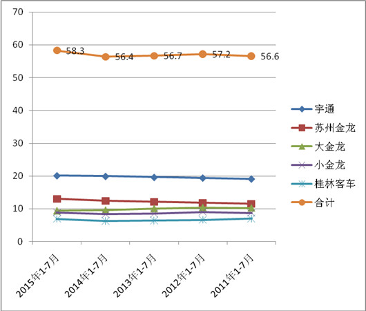 根据上牌数据查阅计算,主流客车企业2015年1-7月及近5年在华南主流区域座位客车市场份额与比较表(%)