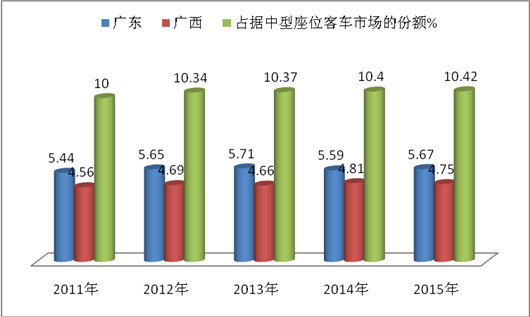 近5年1-7月华南区域中型座位客车市场份额之和占据了总体中型座位市场的份额一直都在10%以上,但随着年份推移,市场份额逐年在上升,即从2011年1-7月的10.0%逐年升高到2015年1-7月的10.42%。