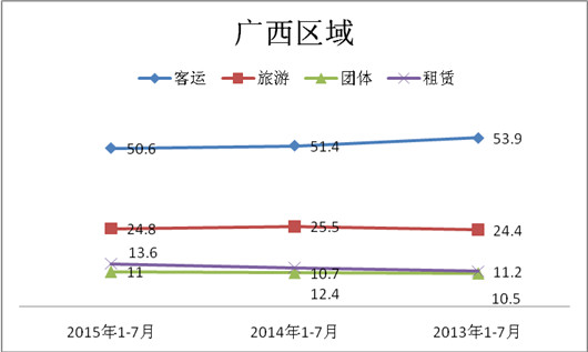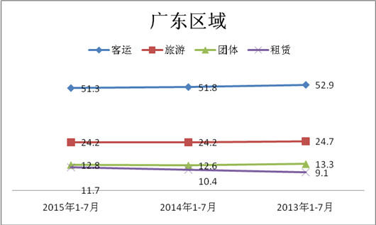 近三年1-7月,华南广东及广西两大区域,座位客车中的市场份额都在逐步下降,而旅游客车和团体客车市场忽高忽低,但总体呈现上升趋势,而租赁客车市场与客运市场正好相反,逐年在上升。即座位客车中传统占主体地位的客运市场有向旅游、团体、租赁等市场转移的迹象。发生上述现象的原因大致是: