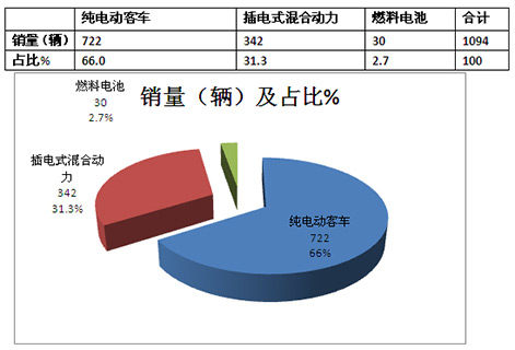 1、根据上牌数据统计,江苏区域2015年1-7月累计销售6米以上新能源客车1094辆,占据全国市场大约7.6%的比例,处于各省份销量之首。其中纯电动客车销售722辆,插电式混合动力客车销售342辆;燃料电池客车销售30辆。