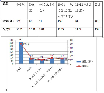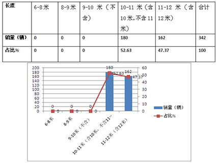 从上图表可见,6-8米长度段占据了江苏区域纯电动客车近50.6%的市场权重,也就是说超过一半的纯电动客车是6-8米长度段。其次是10-11米,再次是11-12米,第四是8-9米,且10-11米、11-12米及8-9米销量比例相差不大,但都远远落后于6-8米长度段。