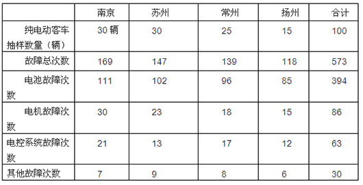 2015年8月上旬,笔者对纯电动客车销量较大的江苏地区的苏州、常州、扬州、南京等几个区域市场抽样选定了2014年销售的100辆纯电动故障发生频率进行了跟踪调研分析,具体如下表:
