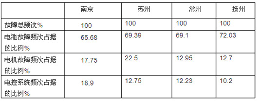 从上表看出,南京、苏州、常州、扬州四个区域市场的抽样的纯电动客车在运营中出现故障频次最高的均是电池故障,而且占比都达到65%以上,换言之,纯电动客车出现故障的主要原因是由于电池技术质量的不过关导致的。