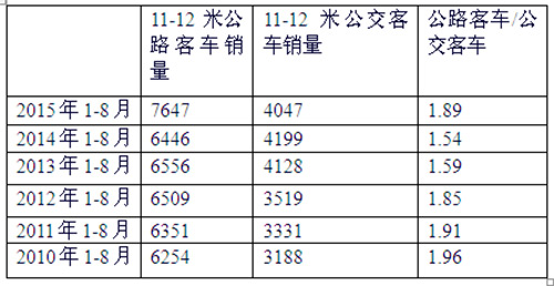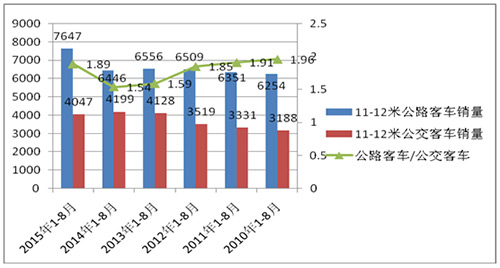特点二:11-12米公路客车主体地位从弱化突然转为增强----近6年中的前5年11-12米公路客车销量与公交销量比值均在逐年减小,但到了2015年1-8月却突然出现拐点