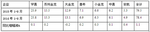 8、2015年1-8月三龙一通、青年、安凯、中通等主流公路客车企业的11-12米公路客车总量占据五大区域市场的集中度为79.5%,而2014年同期其集中度为78.4%,2016年1-8月集中度同比上升了1.1个百分点,一方面说明三龙一通等主流公路客车企业是上述五大主流区域11-12米公路客车的绝对垄断者,同时其垄断地位还在加强,这也从一定程度上说明了三龙一通等强大的原因。