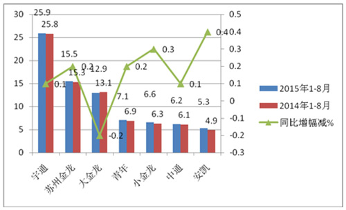 4、小金龙11-12米公路客车市场份额处于第五,增幅也为正值,在2015年1-8月表现尚可。