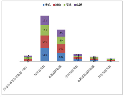 2015年8月上旬,笔者对纯电动客车销量较大的山东地区的青岛、潍坊、淄博、临沂等几个区域市场抽样选定了2014年销售的100辆纯电动故障发生频率进行了跟踪调研分析,具体如下表:
