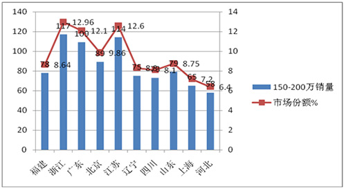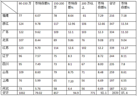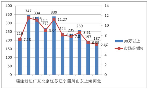 在2015年1-8月,90万以上高档客车市场份额中,全国前10个重点市场中,无论是90万-150万,还是150万-200万、200万以上的细分市场,浙江区域都是市场份额最大的区域市场,因此研究浙江区域高档客车市场显得尤其重要。