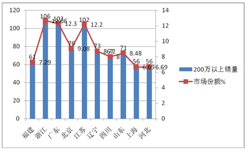 1、在浙江区域的11个地市中,杭州区域高档客车销量最大,其次是宁波,再次是温州,前三个区域共销售178辆,占据了全省销量的51.3%。其余8个区域只有48.7%,可见,高档客车销量在浙江区域分布是不平衡的。
