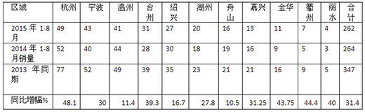 笔者于2015年8月底到9月初,历时10多天,经过对浙江11个地区的各长运公司、高端旅游公司及车管所进行实地调研,2015年1-8月90万以上高档客车在各区域的销量分布汇总统计如下表