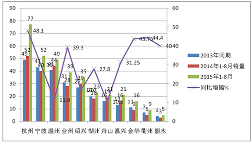 2、与2014年1-8月相比,浙江省的高档客车销量增长了31.4%,,但具体到各个地市,情况又不一样:即:杭州、宁波、温州分别上升了48.1%、30%、11.4%,在11个地市全部正增长,上升最大的是杭州。根据市场调研可知,杭州地区在2015年1-8月11-12米的纯电动和插电式混合动力客车增加了大约100多辆,其中超过70辆价格在90万以上。