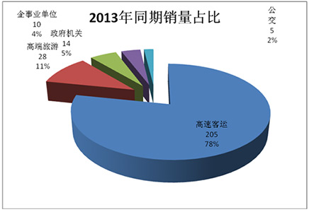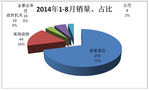 按目标市场用途划分,高速客运公司高端客车销量占据了50.14%的市场份额,是浙江区域高端客车的最大用户。但同比前两年同期,这个细分市场的高端客车市场呈现逐年下降态势;其次是高端旅游市场,近3年1-8月却出现稳步上升态势;再次是政府机关公务用车,这个细分市场也呈现逐年下降态势;第四是企事业单位团体用车,呈现逐年小幅上升态势;这主要与高铁对高端客运市场的挤压、政府机关三公费用压缩等有关。