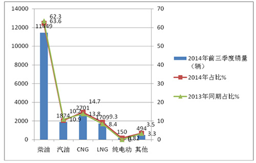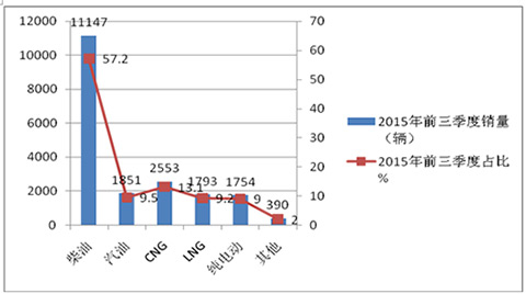 1、2015年1-9月,农村客运市场中销量最大的是柴油,其次为CNG、再次是汽油,第四是LNG,第五是纯电动;柴油仍然占据农村客运市场中占据绝对大的市场份额,但近三年呈现逐年下降态势。