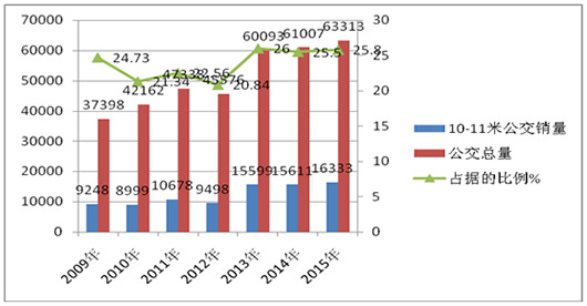 根据市场调研,10-11米公交车是公交市场中次大的细分市场,仅次于11-12米公交市场(11-12米公交占据公交总量的比大约在25