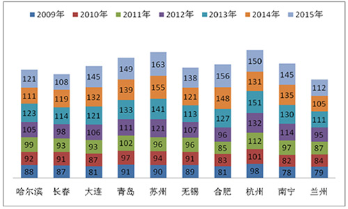 30%左右),10-11米公交约占公交总销量的比例大约在25%左右,是大中城市主干线路的重点车型,尤其是二线城市的主打公交车型,因此也是各重点区域市场的采购重点车型,对整个公交市场的影响可以说举足轻重,因此研究分析10-11米公交市场尤其是重点二线城市的10-11米公交市场就显得非常重要,下面以2015年前三季度哈尔滨、长春、大连、青岛、苏州、无锡、合肥、南宁、杭州、兰州等十大二线城市的10-11米公交市场情况作为对象来分析之。
