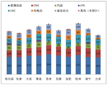 2、在十大二线城市中,传统柴油燃料仍然是10-11米公交的主要配置,CNG是10-11米公交在新能源客车中最为成熟的产品,混合动力其次,纯电动客车销量仍然低于混合动力,LPG和LNG等清洁燃料作为CNG的补充,目前销量也不大,但在苏州、杭州、合肥等区域有发展的趋势。