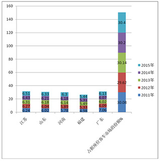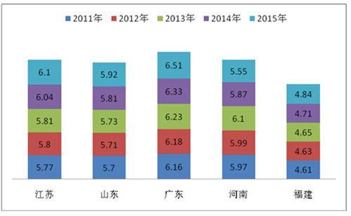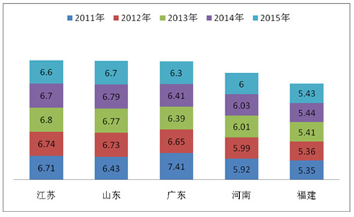 2、近5年来,在江苏、山东、河南、福建、广东等五大主流区域中,江苏、山东、河南区域的市场份额是逐年上升的,福建总体是呈现上升趋势,但中间个别年份出现下降;而广东市场在2011年份额最大,但到了2012年后确是逐年下降的,2014年又略有上升,2015年仍然处于恢复性上升。