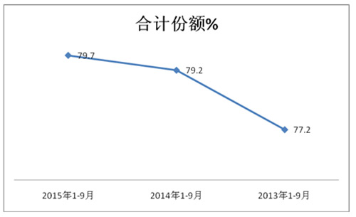 1、全国五大主流区域是座位客车的主流销售区域,其市场集中度近5来均在30%左右,且从2011年1-9月的30.08%曲折升高(2012年除外)到2015年1-9月的30.4%,说明江苏、河南、山东、福建、广东等5大区域市场的座位客车市场集中度整体呈现上升态势。