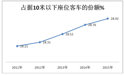 4、小金龙座位客车市场份额处于第四,增幅第二,在2015年1-9月基本处于恢复性增长状态。