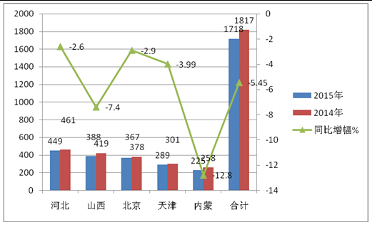 一、2015年前10月华北区域10-11米公路客车总体销售情况概述----总体同比下降5.45%,天津、河北、山西、北京及内蒙同比均下降