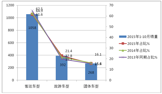 1、2015年1-10月客运车型是华北地区10-11米公路客车最大的目标市场,占据的比例达到61.6%,但同比2014年下降了0.9个百分点,与2013年同期比下降了3.3个百分点。