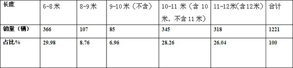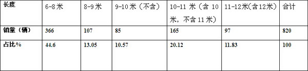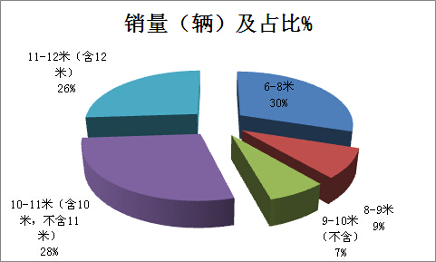 从上图表可见,6-8米长度段占据了湖南区域纯电动客车近44.6%的市场权重,也就是说接近四成半的纯电动客车是6-8米长度段。其次是10-11米,再次是11-12米,第四是8-9米,且10-11米、11-12米及8-9米销量比例相差不大,但都远远落后于6-8米长度段。