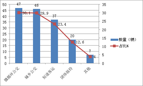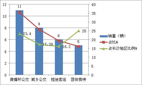 从上图表看出:长沙龙骧公交公司6-8米纯电动客车市场需求的最大目标市场是微循环公交线路,其次是城乡公交线路,再次是短途客运线路,第四是团体接待,占据长沙地区2015年1-10月的比例最大的是团体接待用车,其次是微循环公交比例。