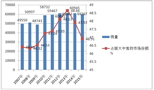 二、对近9年1-11月30-50万中档大中客销量及市场份额分析-----2007年到2009年前11月销量一直维持在50000辆左右,到2010年跳跃式上升到60000辆左右;占据大中客的市场份额一直维持在46-49%之间,2011年-2015几乎维持在60000辆左右的水平,但2015年前11月销量同比下降了1.93%;前7年1-11月以来,中档客车占据大中客市场的比例一直呈现上升趋势,到2014年比例却出现拐点,呈现微弱下滑态势